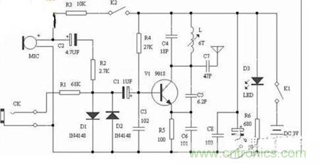 【導讀】FM調(diào)頻發(fā)射機,發(fā)射頻率在模擬廣播波段88~108Mhz,用普通FM收音機接收,2種音信輸入,MIC頭將周邊聲音發(fā)送,CK音信輸入,調(diào)??烧{(diào)發(fā)射線圈L可改變(微調(diào))發(fā)射頻率。