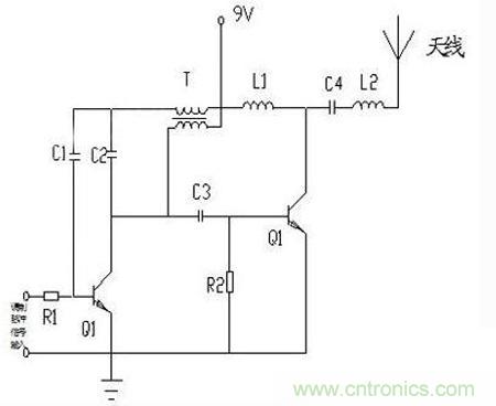 Q2是緩沖放大級,Q1的輸出經(jīng)C3耦合到Q2(圖中右邊的“Q1”)基極,L1是Q2的負載電感;并經(jīng)C4/L2串聯(lián)諧振電路送到天線發(fā)射。R2接地,也就是零偏置,由于輸入信號幅度較大,且是以C4/L2諧振回路來選頻的,所以不怕失真,這樣效率較高。