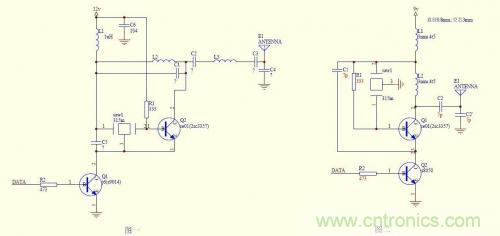 兩電路基本原理一致,都是由0、1信號控制實現(xiàn)高頻脈沖發(fā)射的電路,工作頻率由晶振決定,從穩(wěn)定性上分不出優(yōu)劣。圖二電路簡潔,稍容易調(diào)試些,圖一在三極管集電極與電源間加了選頻網(wǎng)絡,在三極管集電極與天線之間也加了選頻網(wǎng)絡,輸出頻率更純凈,但調(diào)試要麻煩些。再一點區(qū)別是圖二上方三極管的基極通過電阻引入了交流負反饋,其實這對該電路穩(wěn)定性的影響也并不明顯。電源上對地的高頻電容還是保留為好,但圖二中沒有畫出。