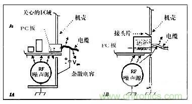 使共模電流注入到I/O區(qū)的另一機(jī)理,是附近有強(qiáng)的干擾源的耦合。甚至有些“屏蔽”連接器也無(wú)用,因?yàn)楦蓴_源就在連接器附近,如PC機(jī)環(huán)境。如果在連接器和底板之間有一個(gè)缺口,此處所感應(yīng)的RF電壓可以使EMC性能下降(圖1B)。