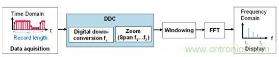 上圖的對(duì)比可以看出來(lái),在窗函數(shù)之前會(huì)進(jìn)行一個(gè)DDC 處理,通過(guò)用戶(hù)設(shè)置中心頻率,設(shè)置初始和截止頻率,處理的結(jié)果是只對(duì)關(guān)心的頻段,或者說(shuō)設(shè)定好的頻段進(jìn)行處理。傳統(tǒng)方式必須對(duì)所有頻段范圍的進(jìn)行fft 運(yùn)算,然后選擇一段頻率來(lái)顯示,運(yùn)算的數(shù)據(jù)量非常大。反過(guò)來(lái)我們的原理是僅對(duì)你感興趣的頻段或者你選擇的初始頻率和截止頻率范圍內(nèi)進(jìn)行處理,當(dāng)然極限情況也是選擇全頻段來(lái)處理,這樣就有機(jī)會(huì)減少數(shù)量量的處理,把處理能力集中在DDC 之后的范圍內(nèi)。下面兩張圖更加清晰告訴傳統(tǒng)方式和我們方式的區(qū)別。