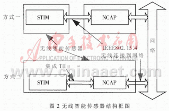 方案之一是無線STIM(智能傳感器接口模型):STIM與NCAP之間不再是TII接口(傳感器獨立接口),而是通過IEEE802.15.4無線(收發(fā)模塊)傳輸信息。傳感器或執(zhí)行器的信息由STIM通過無線網(wǎng)絡傳遞到NCAP終端,進而與有線網(wǎng)絡相連。另外,還可以在NCAP與網(wǎng)絡間的接口替換為無線接口。