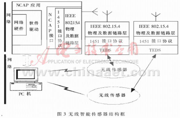 應用層(完成NCAP功能PC主機軟件)和無線傳感器終端模塊(智能傳感器接口模塊STIM)都通過IEEE1451接口協(xié)議與最低層的IEEE802.15.4模塊進行通信。