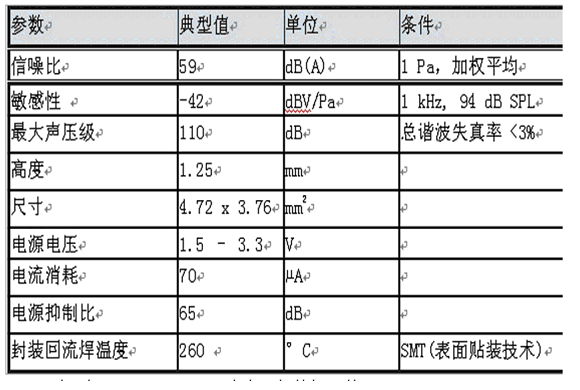 表1:新型SMM310硅基MEMS麥克風(fēng)的特性參數(shù)。