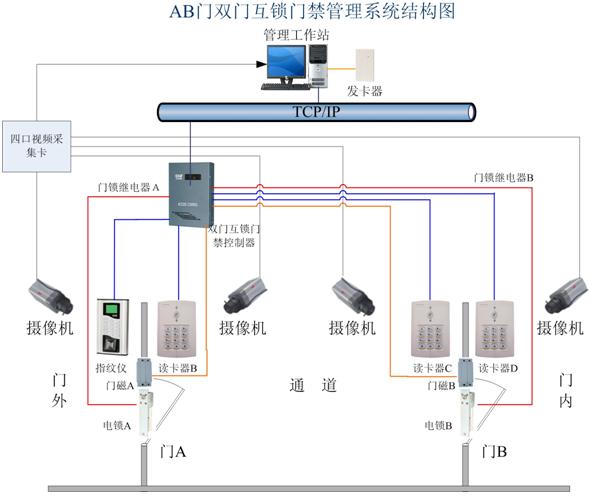 智能卡AB門雙門互鎖門禁是智能門禁系統(tǒng)的一個(gè)非常巧妙的應(yīng)用,在一個(gè)需要嚴(yán)格控制人員進(jìn)出區(qū)域外的通道上安裝雙門互鎖門禁,當(dāng)人員通行時(shí),經(jīng)過(guò)第一道門之后必須關(guān)好該門才能開(kāi)啟第二道門,這樣有效的隔離通道內(nèi)外兩側(cè)的空間,防止了犯罪分子尾隨進(jìn)入安全區(qū)域等情況的發(fā)生。該雙門互鎖系統(tǒng)還可配合閉路監(jiān)控設(shè)備實(shí)現(xiàn)中心對(duì)刷卡人員的監(jiān)控,還可以安裝指紋儀實(shí)現(xiàn)更高級(jí)的指紋AB門雙門互鎖門禁。