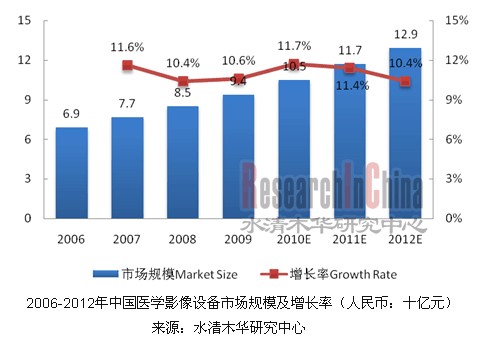 水清木華研究中心指出,近年來,在社會需求劇增、行業(yè)利潤豐厚以及醫(yī)改的背景下,中國醫(yī)學(xué)影像設(shè)備行業(yè)獲得高度發(fā)展。2006至2009年期間,行業(yè)市場規(guī)模從68.7億元人民幣增長至94.2億元人民幣,2006-2009年復(fù)合年增長率為10.9%,預(yù)計到2012年仍能保持10.4%的增長速度。