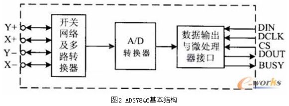 觸摸屏控制器有多種,主要的功能均是在微處理器的控制下向觸摸屏的兩個方向分時施加電壓,并將相應的電壓信號傳送給自身A/D轉換器,在微處理器SPI口提供的同步時鐘作用下將數(shù)字信號讀入微處理器??刂破鰽DS7846基本結構如圖2所示。