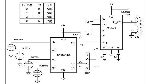為實(shí)現(xiàn)電容式傳感和串行通信,電路設(shè)計(jì)中采用了賽普拉斯公司的CY8C21x34系列的PSoC芯片,其中包含了一組模擬和數(shù)字功能模塊,它們由存儲(chǔ)在板載閃存中的固件來設(shè)置。第二個(gè)芯片處理RS232電平移位,以提供與一臺(tái)主機(jī)的通信鏈路,使電容式傳感數(shù)據(jù)記錄通過串口以115200波特率傳輸給主機(jī)。四個(gè)電容傳感按鍵的引腳分配顯示在圖5中的表中。通過ISSP接口和編程引腳SCL、SDA對PSoC進(jìn)行編程。ISSP接口中包含電源和地,而PC主機(jī)連接到電容式傳感電路板通過標(biāo)準(zhǔn)的DB9連接器。