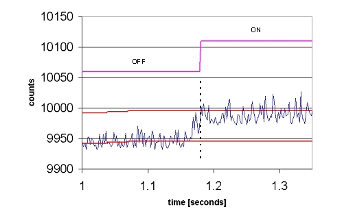 通過一個(gè)終端仿真程序,在主PC上獲得差分計(jì)數(shù),然后借助電子制表軟件加以繪制。將手指放置在10mm厚的玻璃覆蓋層上,并持續(xù)3秒的時(shí)間。按鍵的開關(guān)狀態(tài)被疊加在原始計(jì)數(shù)上。按鍵在這兩種狀態(tài)之間干凈利落地轉(zhuǎn)換,即使是由于通過厚玻璃進(jìn)行檢測而使原始計(jì)數(shù)信號中具有較大的噪聲時(shí)也是如此。請注意手指和按鍵門限隨著基線的漂移而進(jìn)行周期性調(diào)整。當(dāng)檢測到手指的觸壓動(dòng)作時(shí),基線值將鎖定,直到手指移開為止。