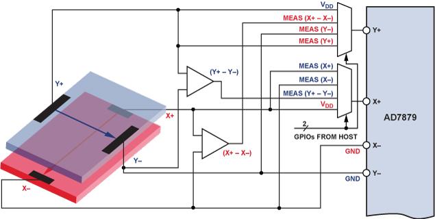 在前半周期中,將一個(gè)直流電壓施加于上層(有源層),并測(cè)量X+引腳的電壓(對(duì)應(yīng)于VY+ – VY–),以提供與Y方向上的運(yùn)動(dòng)(接近還是分開)相關(guān)的信息。