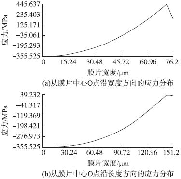 本文以量程0.1 MPa 的犧牲層結構壓力傳感器為例,設計出電壓源E =5 V 時,滿量程輸出為60 mV的壓力芯片。為了滿足靈敏度的設計要求,改變彈性膜片的寬度、長度、厚度和犧牲層厚度對應力分布進行模擬仿真( 模擬仿真時多晶硅楊氏模量EX = 1.7 ×1011 N/m2,泊松比PRXY =0.24,多晶硅納米薄膜應變因子G =30) ,經過優(yōu)化后,得到滿足設計要求的彈性膜片尺寸: 長度a = 300 μm、寬度b = 150 μm、膜片厚度H1 =3 μm、犧牲層厚度H2 =3.5 μm。