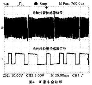 通過圖4還能看出曲軸位置傳感器波形出現(xiàn)2次才與凸輪軸位置傳感器波形重合一次起始位置,這種關(guān)系和本車曲軸轉(zhuǎn)速與凸輪軸轉(zhuǎn)速比為2:1的關(guān)系一致,也正好是1缸上止點的位置,也就是1缸點火正時的基準(zhǔn)位置,也決定了其它3個缸的點火時刻。此信號傳輸給腳,ECU就能發(fā)出點火信號,起動發(fā)動機。否則ECU就不發(fā)出點火信號,發(fā)動機不能起動。