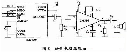 語音電路原理圖如圖3所示,由美國ISD公司的語音芯片ISD4004-16和美國國家半導體公司的音頻功率放大器LM386等元件構(gòu)成。ISD4004 -16錄放時間為16 min(可分段),它采用CMOS技術(shù),單電源3 V工作,內(nèi)含振蕩器、抗混疊濾波器、平滑濾波器、音頻放大器、自動靜噪及高密度多電平閃爍存貯陳列。它內(nèi)置微控制器SPI總線串行通信接口??蓪⒛M語音數(shù)據(jù)直接寫入單個存儲單元,不需通過A/D或D/A轉(zhuǎn)換。使得ISD語音電路具有音質(zhì)自然、使用方便、單片存儲、反復錄放、低功耗、抗斷電等許多優(yōu)點。LM386工作電壓范圍寬,電壓增益可調(diào)。具有自身功耗低、電壓增益可調(diào)整電源電壓范圍大、外接元件少和總諧波失真小等特點。本設計中STM32F103VC通過SPI2給ISD4004傳送語音信息。圖3中的V1和V2分別經(jīng)三極管與+3.3 V和+12 V電源相連,三極管的通斷由STM32F103VC的PCI1和PCI2控制,只有在需要語音提示時,才使三極管導通給ISD4004和LM386供電。