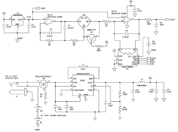 該電路由兩節(jié)AAA電池供電。使用二極管提供反向電壓保護(hù)會浪費(fèi)寶貴的電能,因此本電路使用P溝道MOSFET (Q2)。該MOSFET通過阻塞反向電壓來保護(hù)電路,施加正電壓時導(dǎo)通。MOSFET的導(dǎo)通電阻小于100 mΩ,因此它引起的壓降遠(yuǎn)小于二極管。除AAA電池以外,降壓-升壓調(diào)節(jié)器ADP2503還允許使用最高5.5 V的外部電源。在省電模式下工作時,ADP2503的功耗僅38 μA。由L2、C12和C13構(gòu)成的濾波器可消除模擬電源軌產(chǎn)生的任何開關(guān)噪聲。連接外部電源時,該儀表不是通過一個電路來斷開電池,而是利用一個插孔以機(jī)械方式斷開電池,從而避免電能浪費(fèi)。