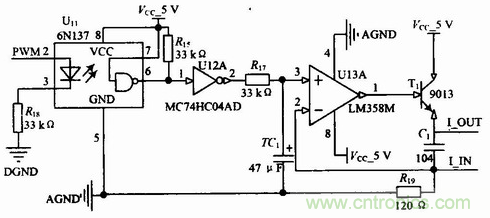 數(shù)據(jù)處理單元具備一路可控4~20 mA的電流輸出,用于現(xiàn)場指示儀表的驅(qū)動。具體的連接電路如圖4所示。其中PWM2連接ARM的PWM2引腳,PWM信號用于控制光耦的導(dǎo)通與截止,反相器主要用于波形的整定,根據(jù)磁敏角度和位移關(guān)系,建立數(shù)學(xué)模型,計(jì)算出PWM的占空比,從而達(dá)到電流大小調(diào)節(jié)的目的。