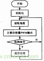 軟件編程主要包含3個模塊:PWM控制電流輸出模塊、RS 485通信模塊、MLX90316的SPI通信模塊,編程流程如圖5所示。PWM控制電流輸出模塊主要通過改變PWM的占空比來調(diào)節(jié)電流的大小。RS 485通信模塊主要用來接收上層系統(tǒng)的指令并根據(jù)指令將數(shù)據(jù)回傳。MLX90316的SPI通信模塊主要用于磁敏角度的讀取,SPI的通訊過程為:主控端先輸出1個0xAA以及1個0xFF作為通信起始信號,然后接著輸出8個0xFF,而從端會同時輸出2個0xFF、4個字節(jié)的角度信號以及4個0xFF,從而完成一次數(shù)據(jù)通訊。