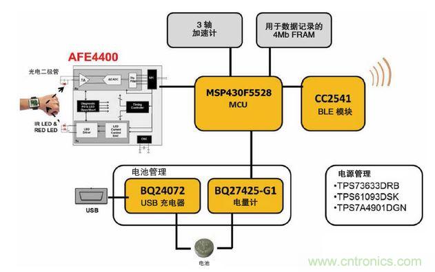 圖4中就是這樣一個(gè)TIDesign (TIDA-00011),其中展示了一個(gè)典型的光學(xué)、佩帶在手腕上的心率系統(tǒng)應(yīng)用。這個(gè)手腕佩帶式心率監(jiān)視器參考設(shè)計(jì)說(shuō)明了TI技術(shù)是如何組合在一起來(lái)提供完整解決方案的。使用一個(gè)LED到光電二極管光信號(hào)的轉(zhuǎn)換,TI的AFE4400($3.3188)感測(cè)由佩帶者脈搏跳動(dòng)所引起的皮膚表面變化,然后將模擬信號(hào)放大并轉(zhuǎn)換為數(shù)字信號(hào),然后再將此數(shù)字信號(hào)傳遞給MSP430($2.0250) MCU?;赥I SimpleLinkTM Bluetooth低能耗CC2541($2.3625)無(wú)線(xiàn)MCU的模塊提供到智能手機(jī)或其他本地系統(tǒng)的無(wú)線(xiàn)連接。非易失性鐵電隨機(jī)存儲(chǔ)器提供數(shù)據(jù)記錄功能,而加速計(jì)感測(cè)身體運(yùn)動(dòng)。此參考設(shè)計(jì)還包括管理電池電量和不同系統(tǒng)功能的器件。希望設(shè)計(jì)此類(lèi)終端設(shè)備的開(kāi)發(fā)人員可以從TI直接訪(fǎng)問(wèn)所有內(nèi)容,原樣搭建這一系統(tǒng),并且立即運(yùn)行。在這里,要定制解決方案,開(kāi)發(fā)人員只需添加其自己的知識(shí)產(chǎn)權(quán)即可。