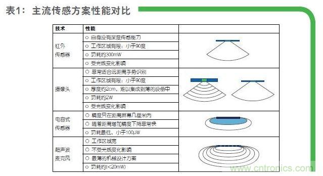 在數字超聲波麥克風出現后,由于對環(huán)境光線沒要求(黑暗中也能精準感測)、很容易測得距離/景深等特殊性能,有先見的系統(tǒng)公司紛紛采用該技術實現一些特有的手勢識別、距離感應等應用。Khamharn指出超聲波的方案性能相對更穩(wěn)定且成本更低,特地為大家對比了超聲波麥克風和目前主流傳感器的性能對比,如表一所示。
