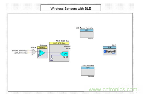 內(nèi)置BLE功能的處理器的靈活性和豐富資源,使傳感器能夠與單一BLE設備連接。圖2是使用PSoC Creator的典型配置。PSoC Creator是一個用于圍繞PSoC架構開發(fā)應用程序的IDE。圖中顯示的是模擬和數(shù)字傳感器接口以及BLE子系統(tǒng)。該配置展示的是用于感測煙霧、光照強度、溫度、濕度和壓力的典型工業(yè)數(shù)據(jù)監(jiān)測系統(tǒng)。配置中的每個組件都有一個關聯(lián)的應用程序編程接口(API),開發(fā)人員可根據(jù)需要訪問這些組件。每個組件還有一個與其相關的數(shù)據(jù)表對組件的可用配置進行說明。