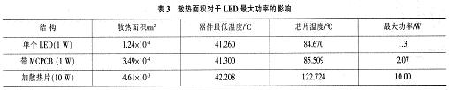 表3為3種不同散熱方式對(duì)LED的溫度分布、最大功率的影響??梢钥闯觯黾由崦娣e是很好的散熱方式,可以輕易地提高LED器件散熱能力,這是目前LED產(chǎn)品所普遍使用的散熱方式之一。然而缺點(diǎn)也很明顯:影響成本、增加產(chǎn)品重量、影響封裝密度。無限度地提高LED散熱片面積顯然不現(xiàn)實(shí),因此一般使用1.5inch2散熱片提升LED產(chǎn)品最大功率至10W左右,出于成本等因素就不能繼續(xù)提高。